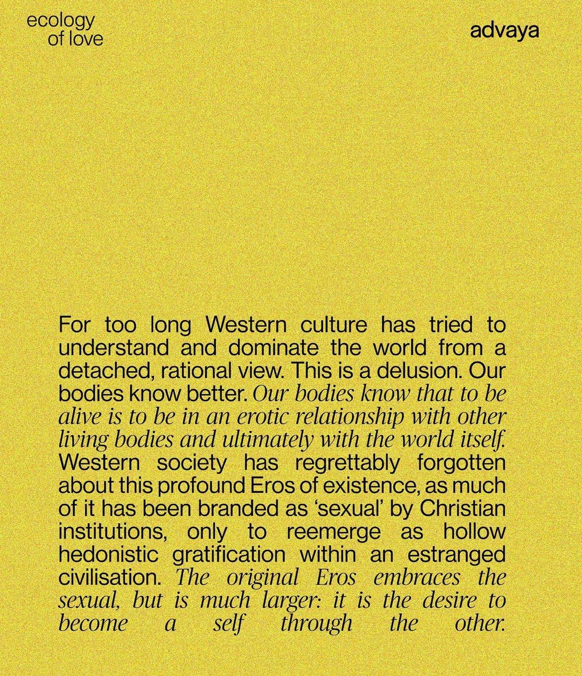 - This post has shifted my definition and fascination with the word “eros”. It’s been sitting in my archive of saved material for a few months and it is one I find myself returning to intermittently to get a whiff of the ecstatic joy I felt when I first came in contact with this concept. The fundamental desire of matter to live, the energetic distance between all living organisms, the entire ecology of life— is eros. This poetic understanding of existence has ignited a shift in how I perceive my eyes’ lens, experience sensorial stimulus, listen to music. It’s a profound awareness of distance between myself and the world that makes me feel closer to what is around me. To understand better check out Minna Salami’s “Sensous Knowledge”.